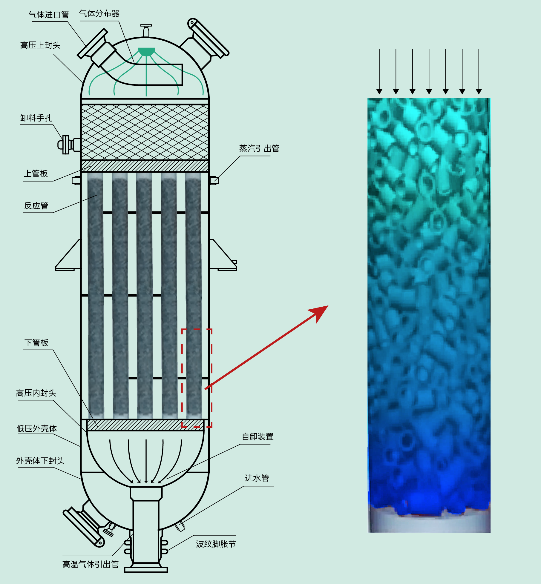 反应器是合成装置的核心,为了解决反应管与壳体间存在的热膨胀力,使管板与壳体焊缝不被拉裂,采用一种浮头式等温反应器。