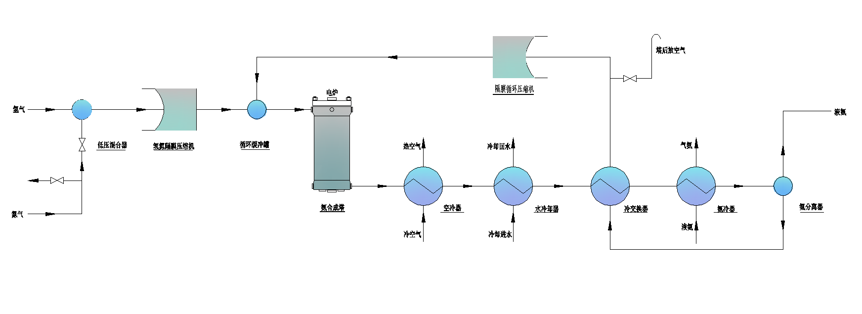 技术方案氢气与氮气按比例混合,进入压缩机压缩到9MPa,经过压缩的氢氮气与循环机出口的循环工艺气一同进入氨合成塔,工艺气在氨合成催化剂作用下发生氨合成反应,出氨合成塔的工艺气依次经过空冷器,冷交换器,氨冷器进行冷却后,进入高压氨分进行液氨分离。分离氨后的气体再进入冷交换器回收冷量后进入循环机提压,如此循环。氨分离器分离出的液氨,减压至送入中压氨分,闪蒸气返回压缩机加压利用,液氨在中压氨分罐储存。